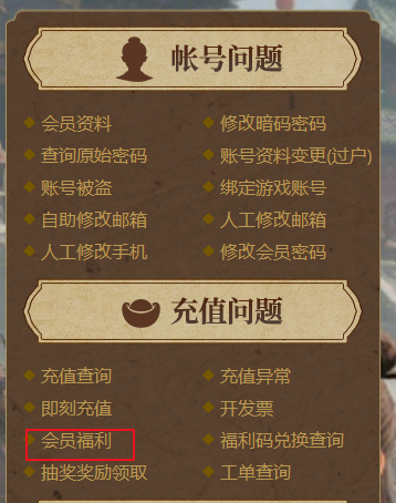 三、点击左侧导航栏-充值问题-会员福利