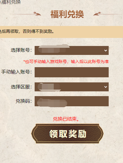点击点此兑换,进入领取页面,选择需要领取的游戏账号,这里需要注意,请先在新区完成创建角色后再领取相应的福利,如账号没有创角,则领不到奖励,兑换码作废。